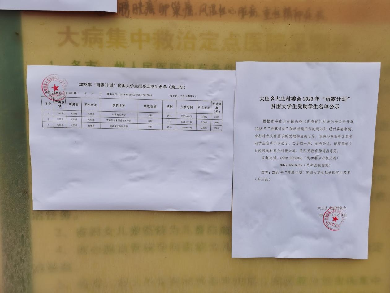 大庄乡大庄村2023年“雨露计划”贫困大学生受助名单公示(第三批)
