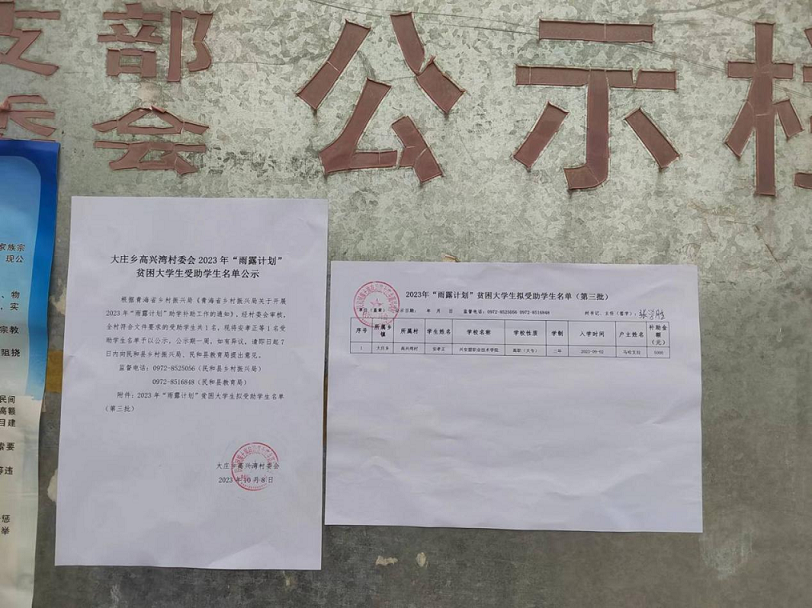 大庄乡高兴湾村2023年“雨露计划”贫困大学生受助名单公示(第三批)