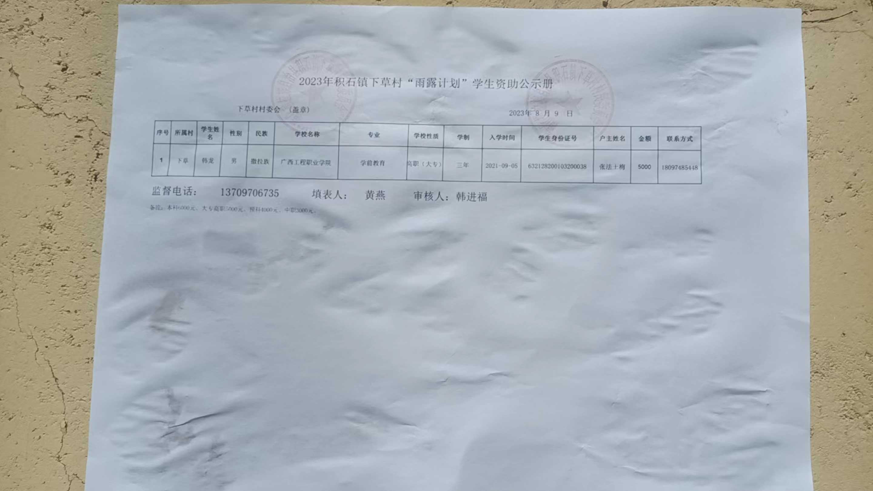 下草村雨露计划享受人员公示