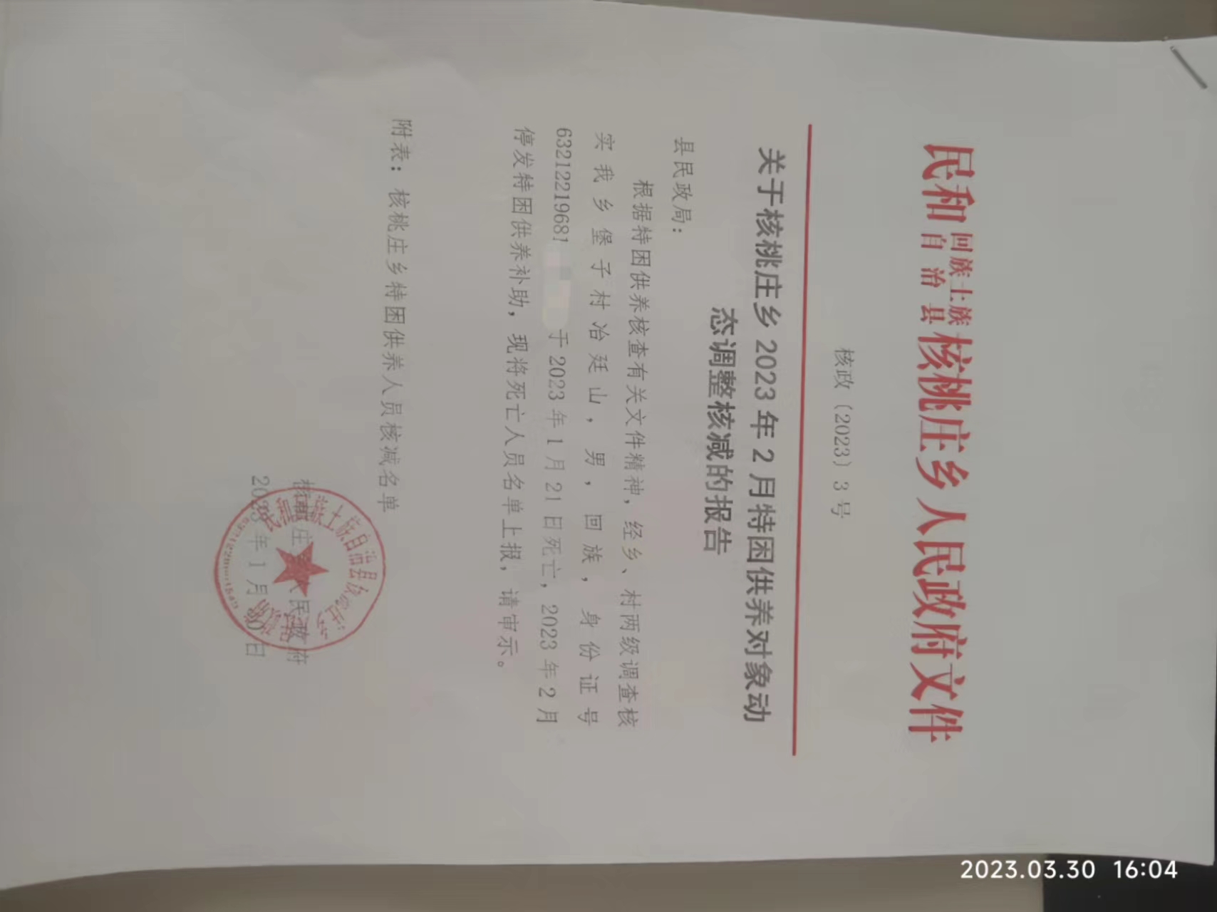 核桃庄乡2023年2月份特困供养对象动态调整核减报告