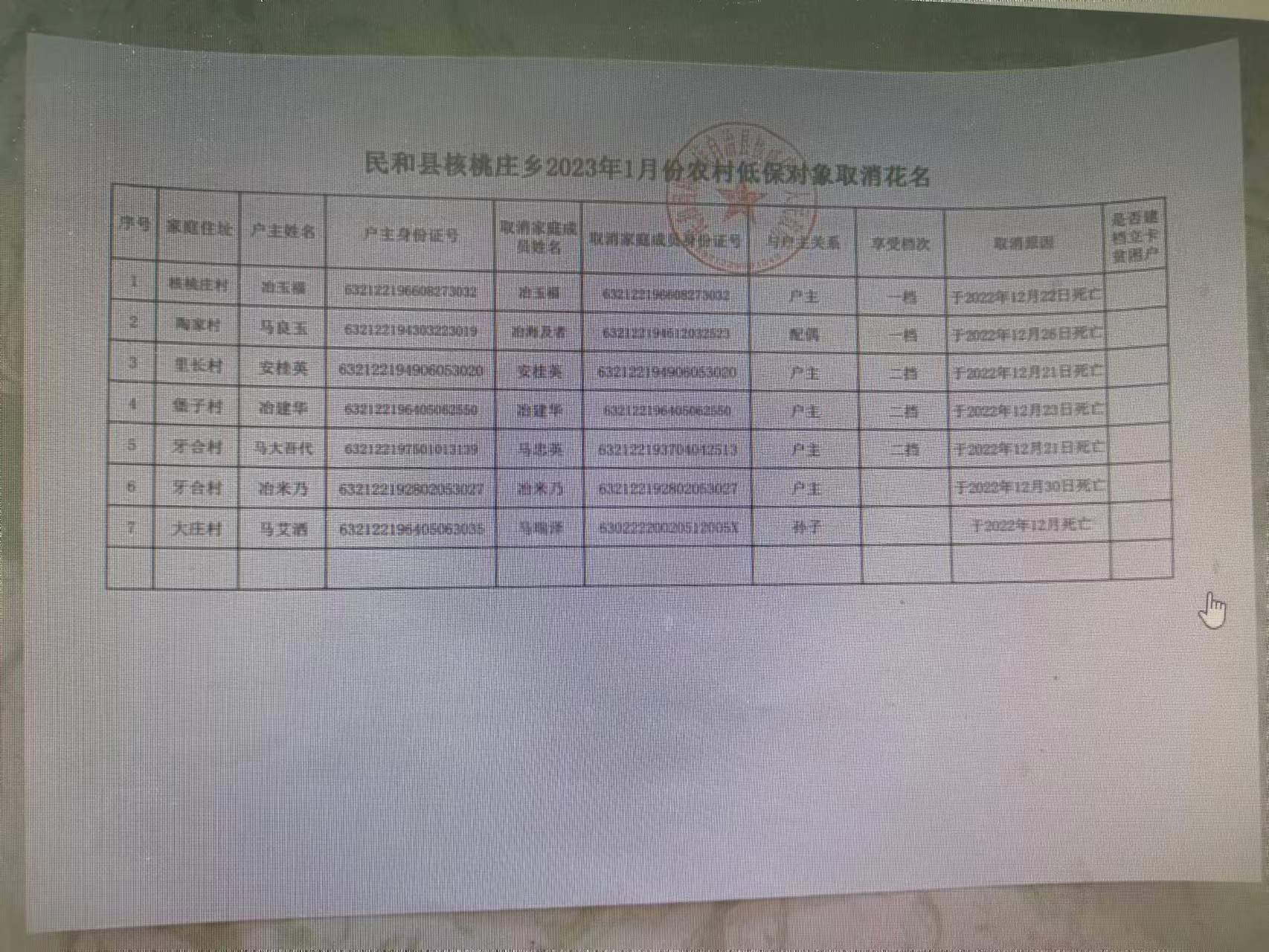 核桃庄乡2023年1月份农村低保对象取消花名公示