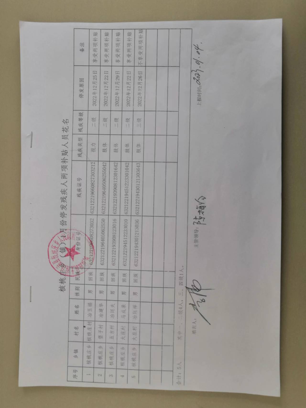 核桃庄乡2023年1月份停发残疾人两项补贴人员花名