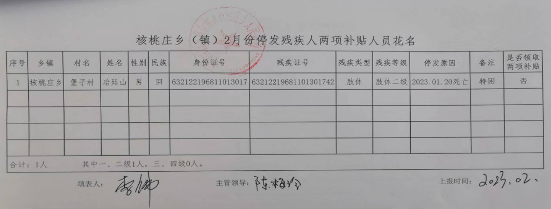 核桃庄乡2月份停发残疾人两项补贴人员花名