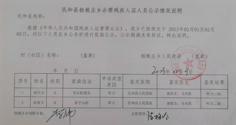 核桃庄乡2023年办理残疾人证人员公示情况说明