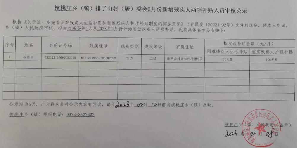 排子山村2023年2月份新增残疾人两项补贴人员审核公示