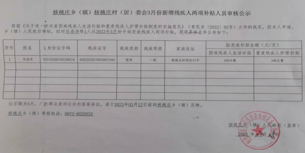 核桃庄村2023年3月份新增残疾人两项补贴人员审核公示