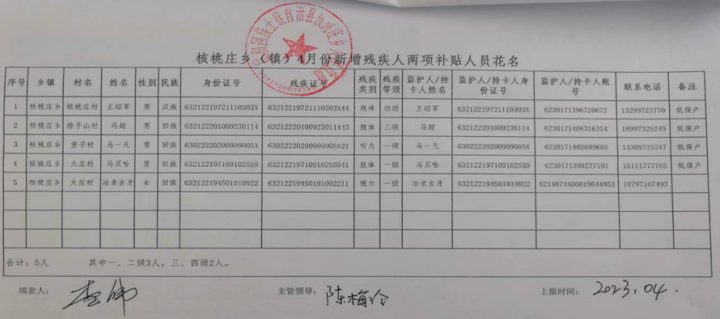 核桃庄乡2023年4月份新增残疾人两项补贴人员花名