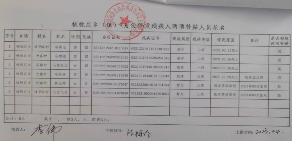 核桃庄乡2023年4月份停发残疾人两项补贴人员花名