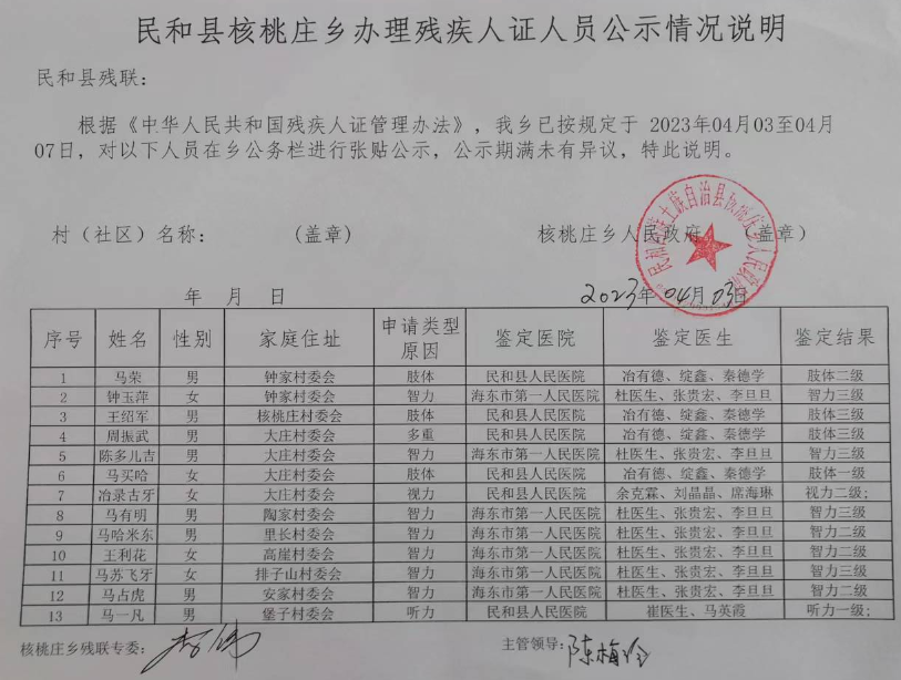 核桃庄乡2023年4月份办理残疾人证人员公示情况说明