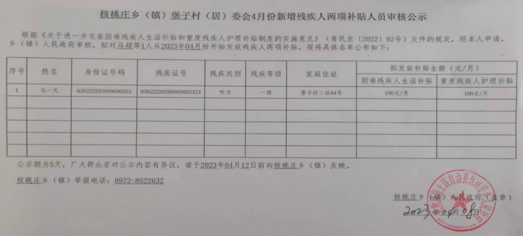 堡子村2023年4月份新增残疾人两项补贴人员审核公示