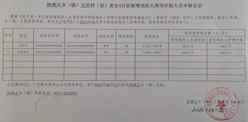 大庄村2023年4月份新增残疾人两项补贴人员审核公示