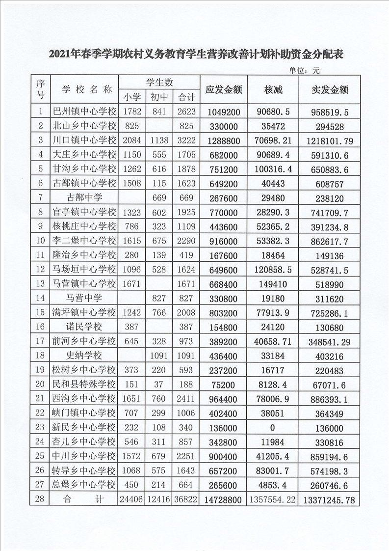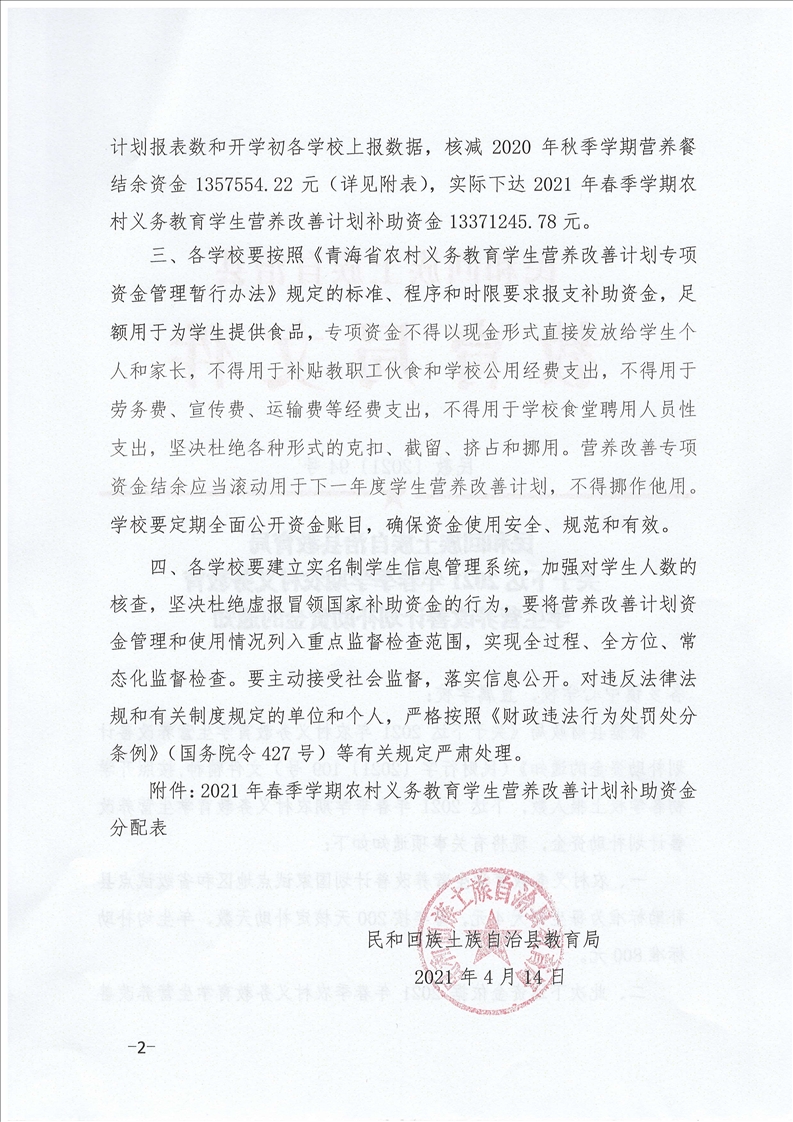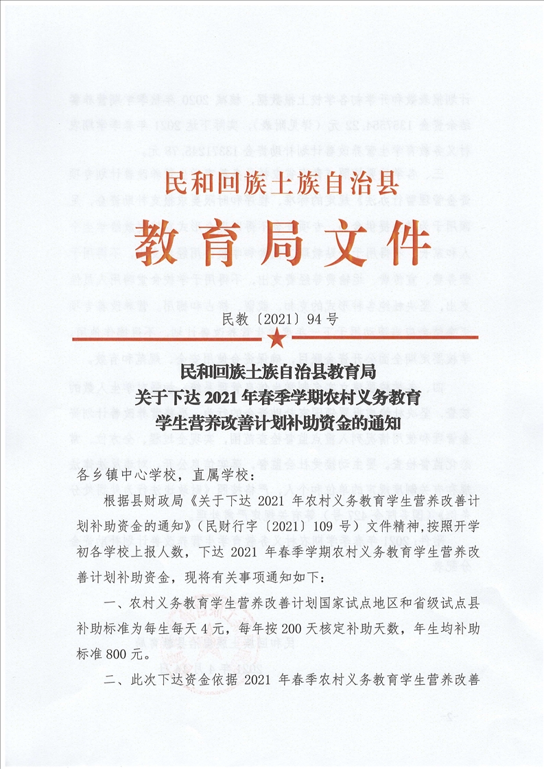 关于下达 2021年春季学期农村义务教育 学生营养改善计划补助资金的通知