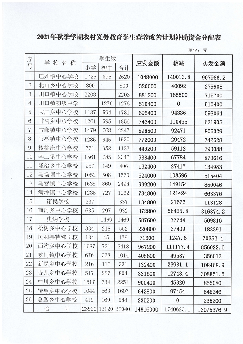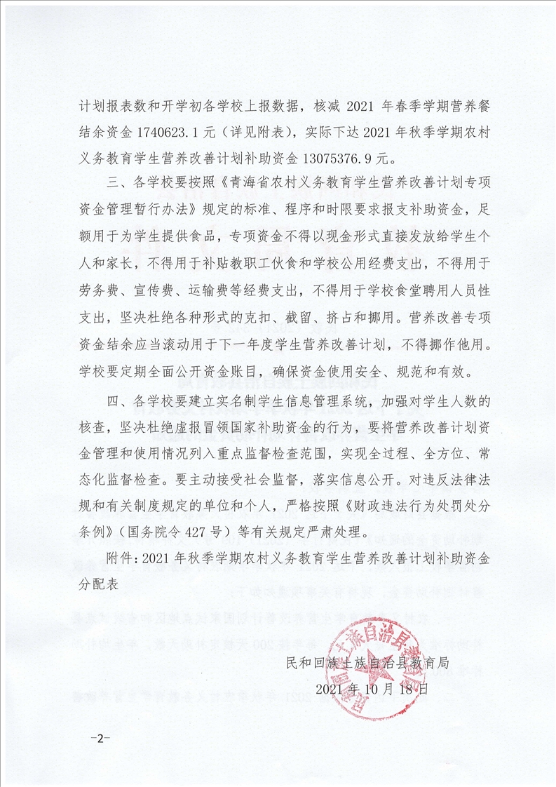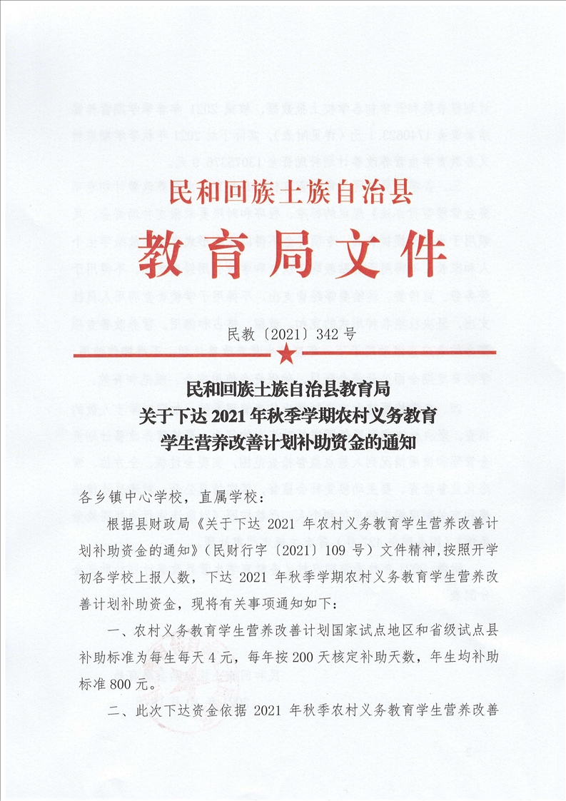 关于下达2021年秋季学期农村义务教育 学生营养改善计划补助资金的通知