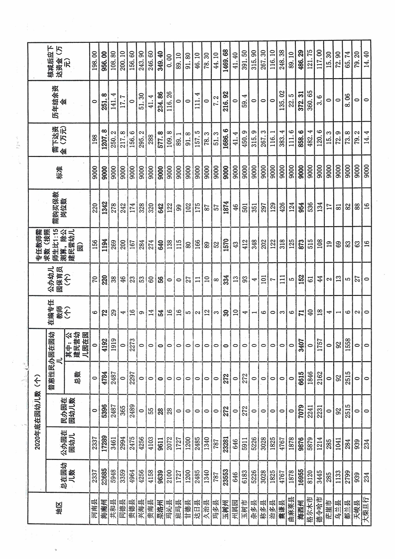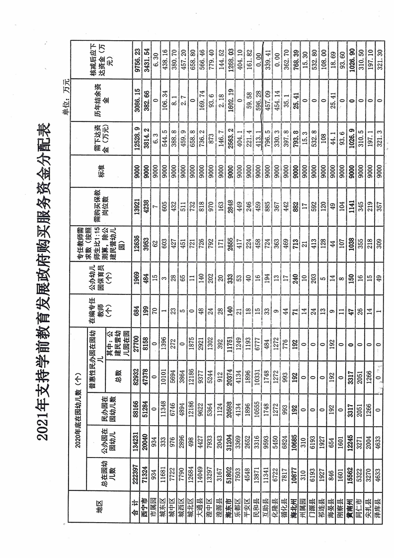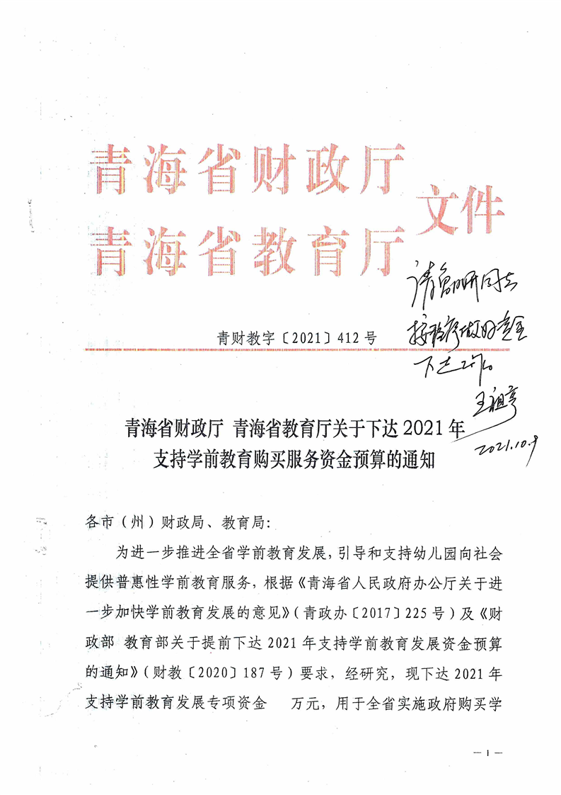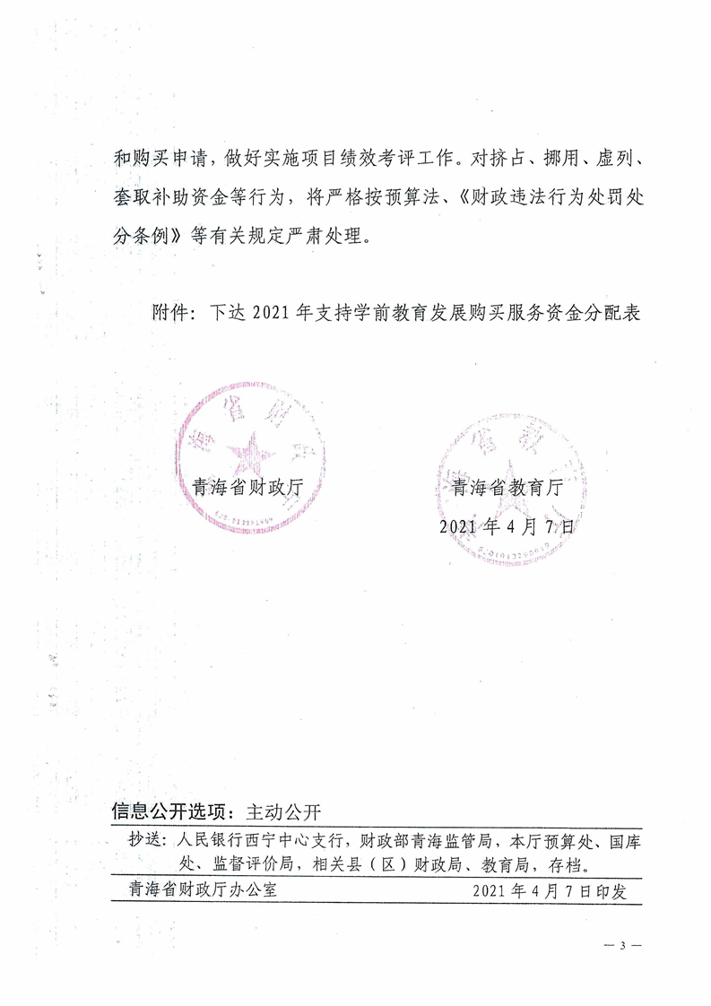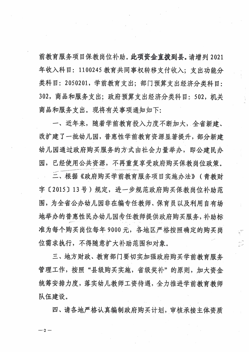 青海省财政厅 青海省教育厅关于下达2021年支持学前教育购买服务资金预算的通知