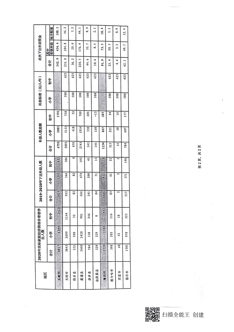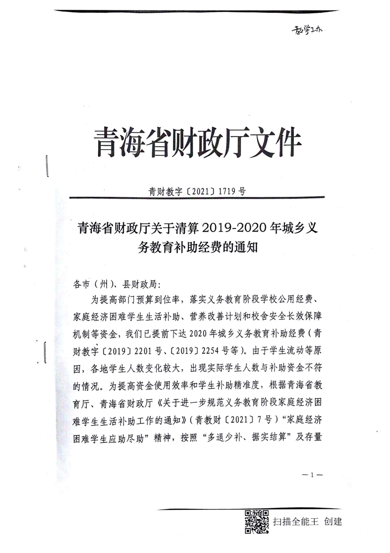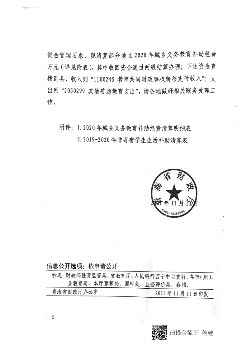青海省财政厅关于清算2019-2020年城乡义务教育补助经费的通知