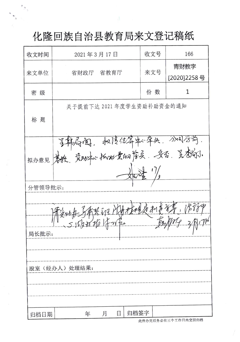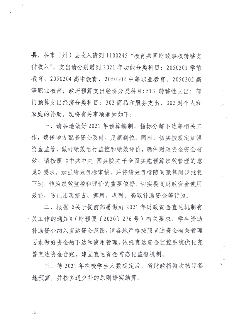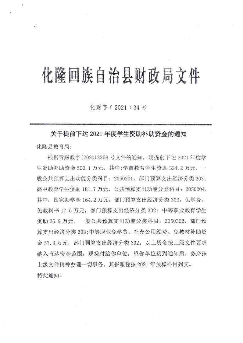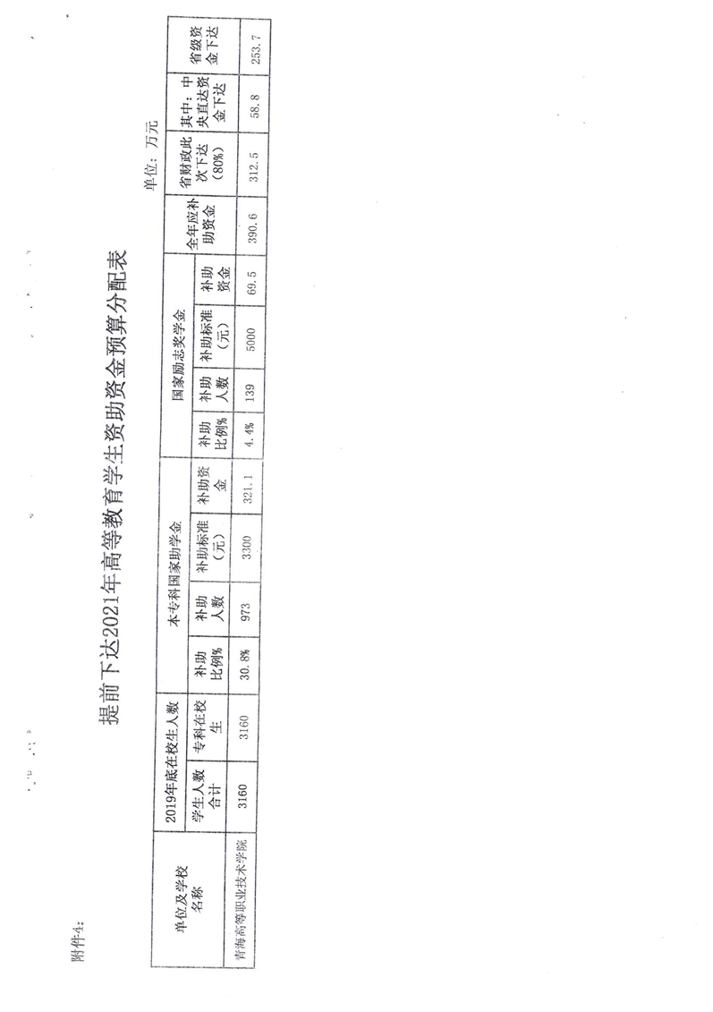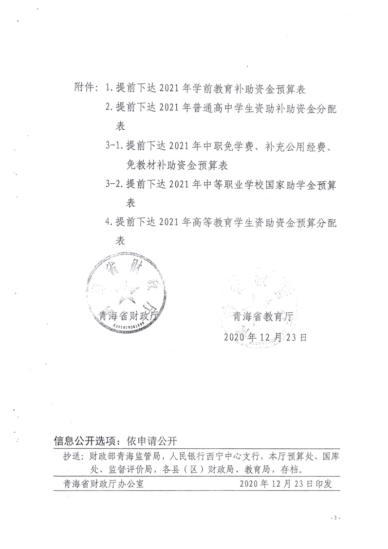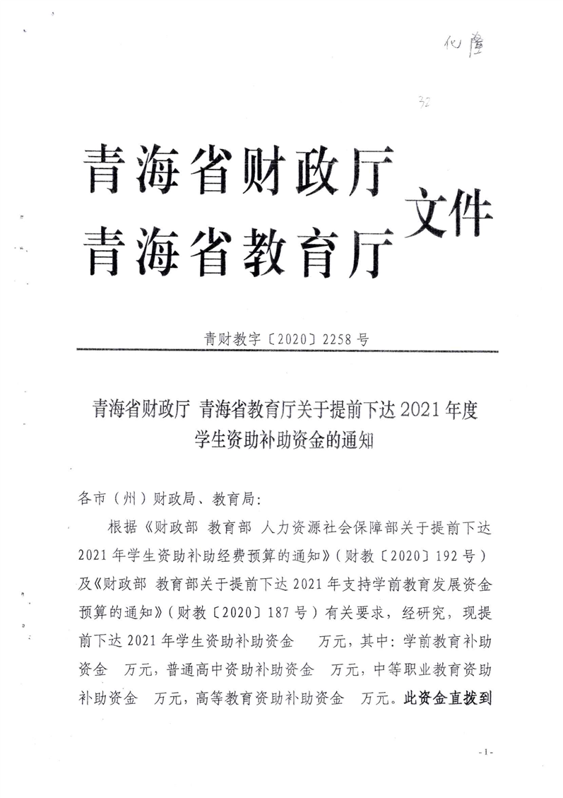 青海省财政厅青海省教育厅关于提前下达2021年度学生资助补助资金的通知