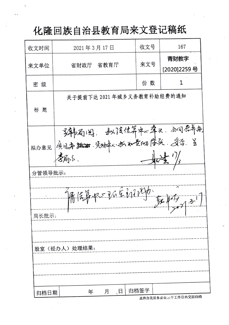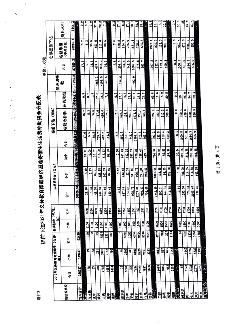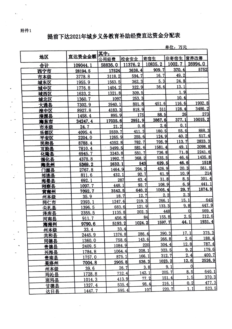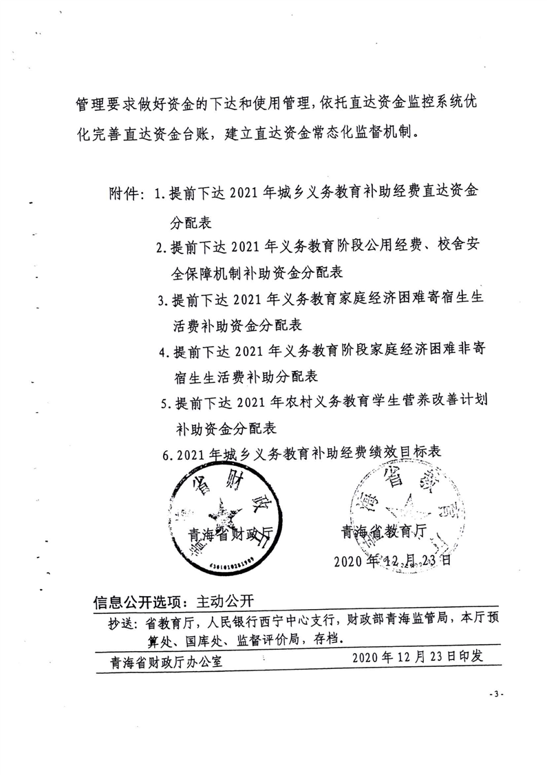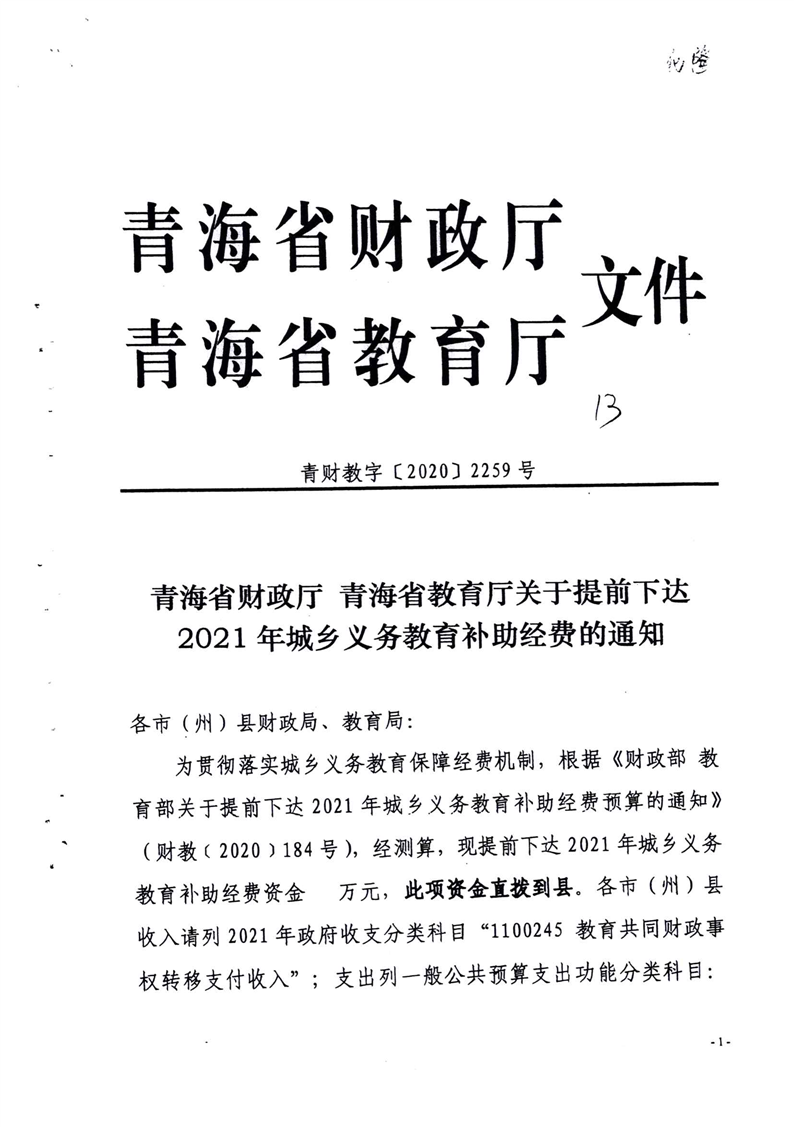 青海省财政厅青海省教育厅关于提前下达2021年城乡义务教育补助经费的通知