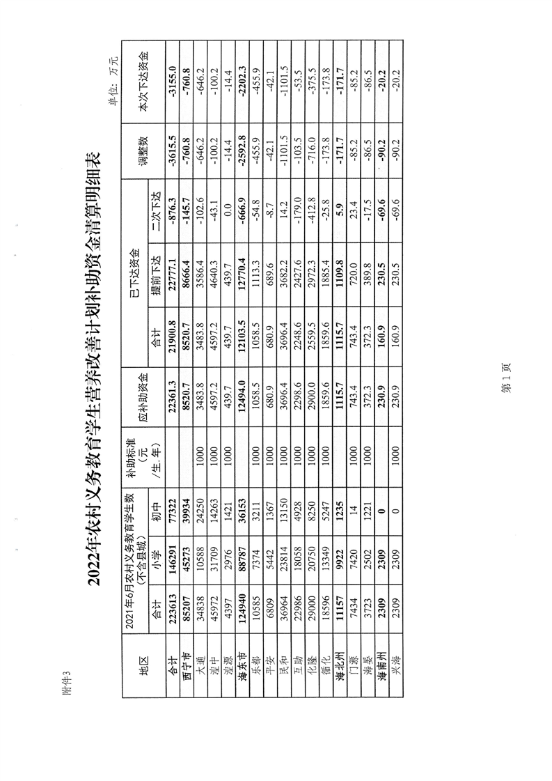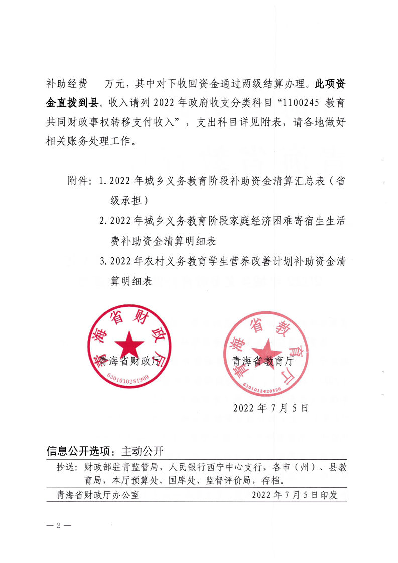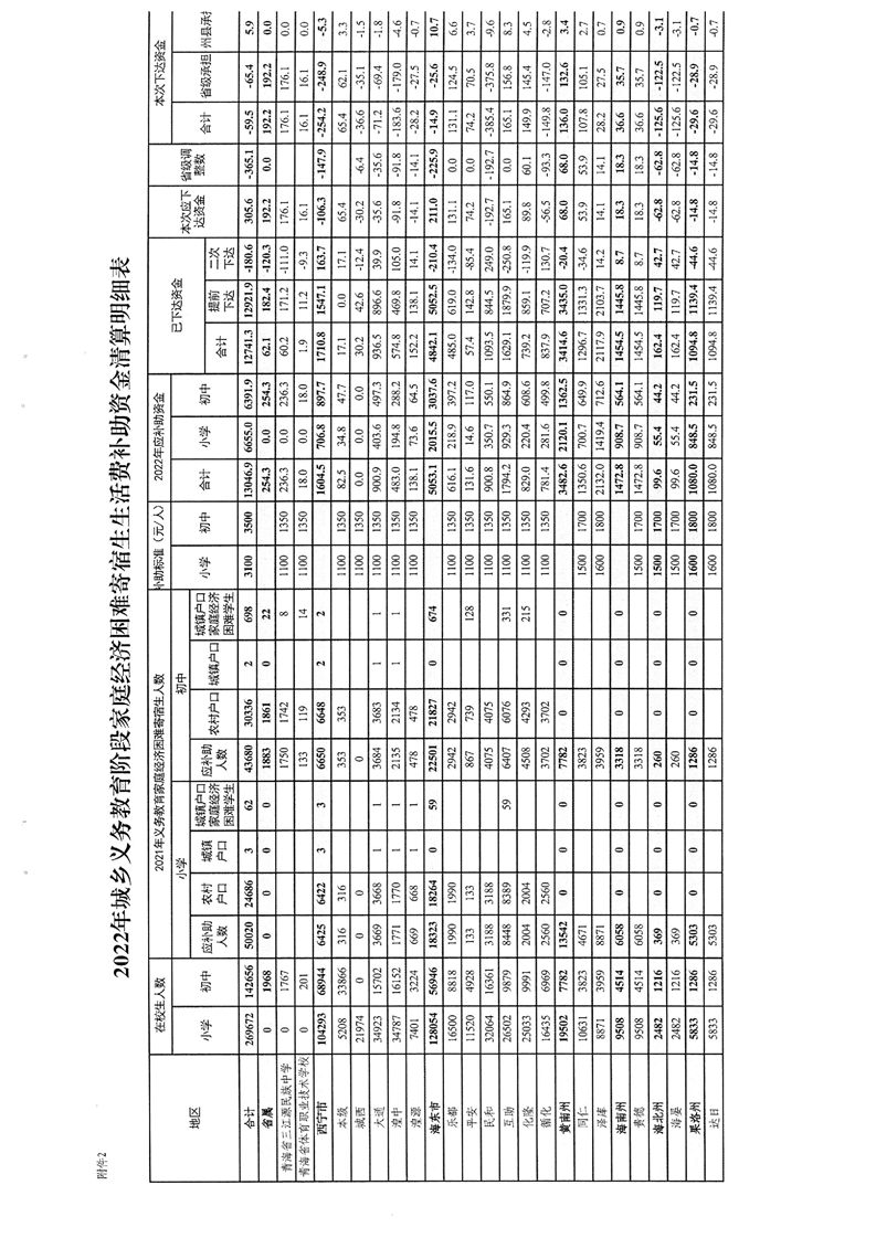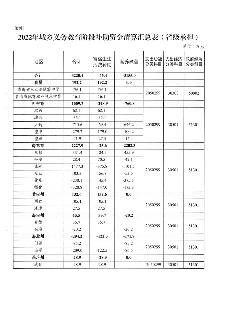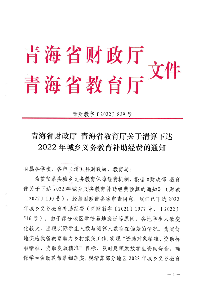 青海省财政厅青海省教育厅关于清算下达2022年城乡义务教育补助经费的通知