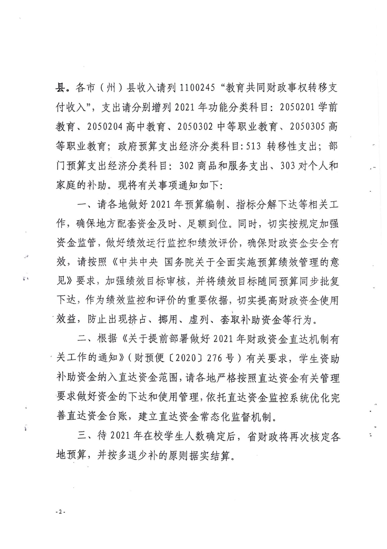 青海省财政厅青海省教育厅关于提前下达2021年度学生资助补助资金的通知