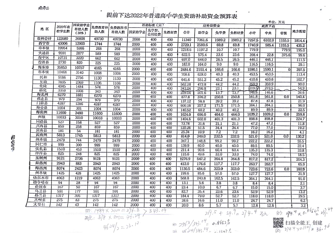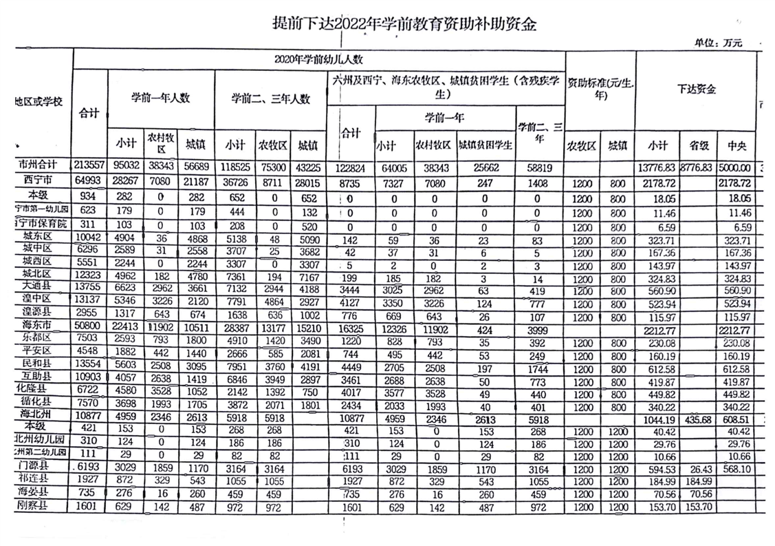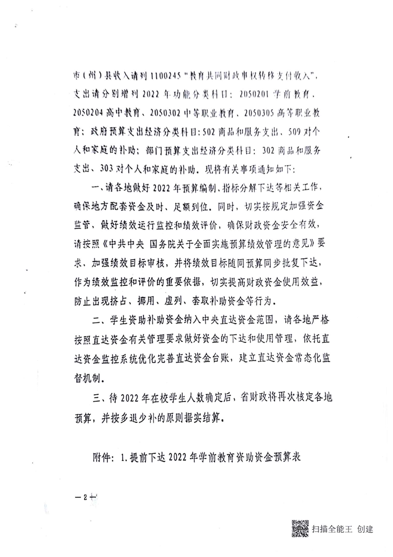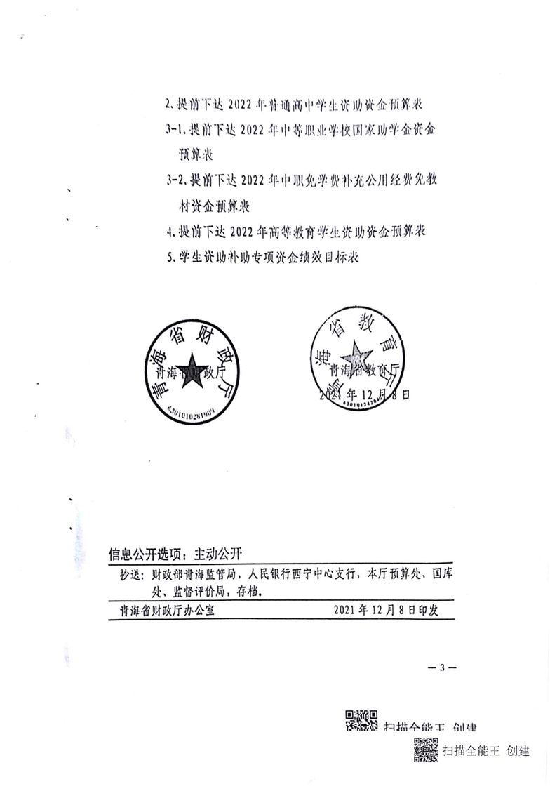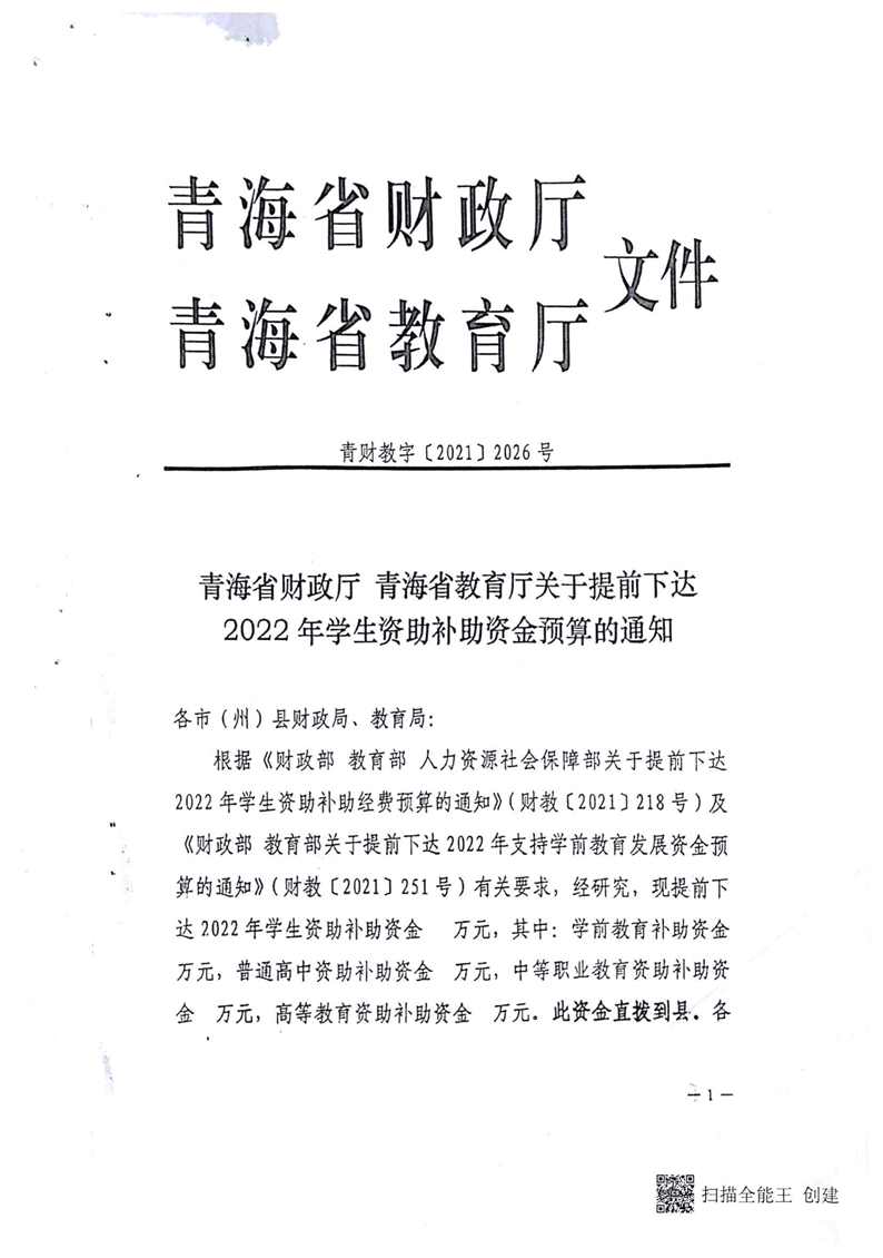 青海省财政厅青海省教育厅关于提前下达2022年学生资助补助资金预算的通知