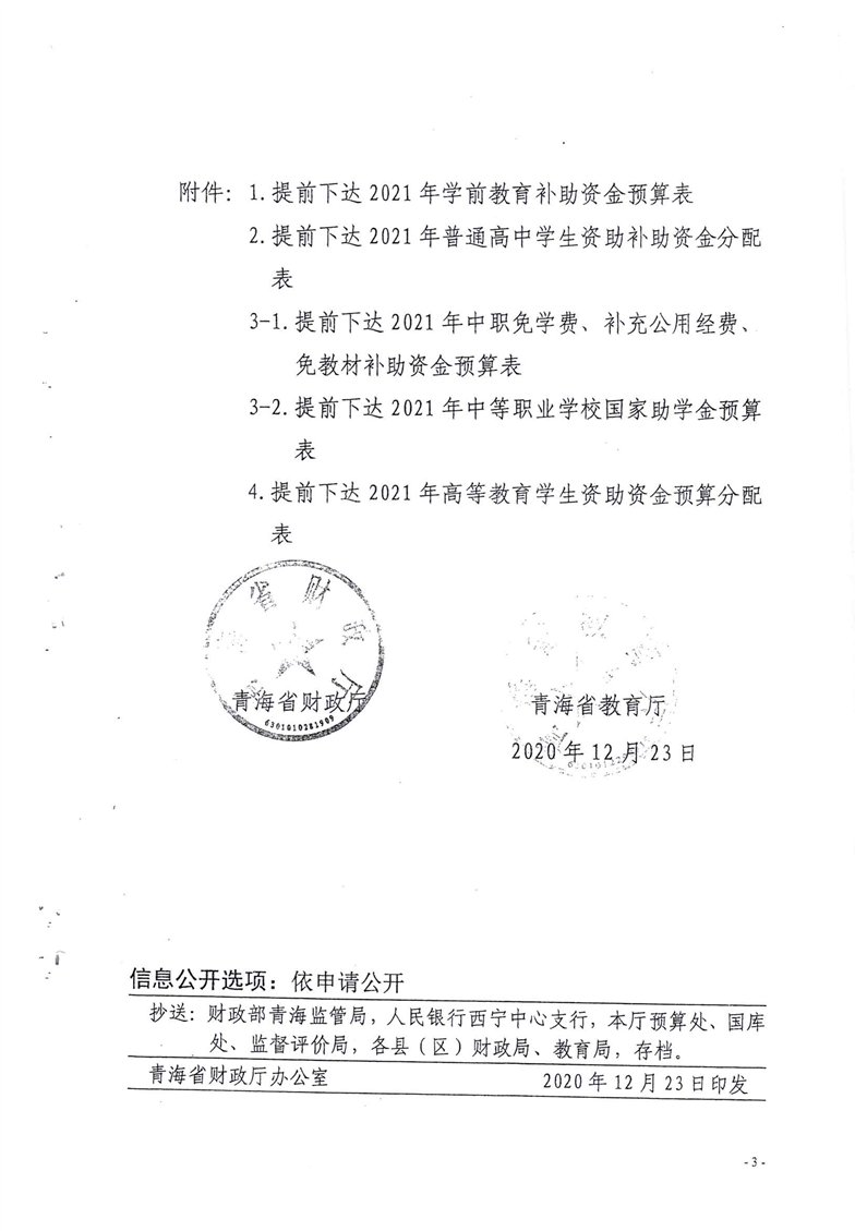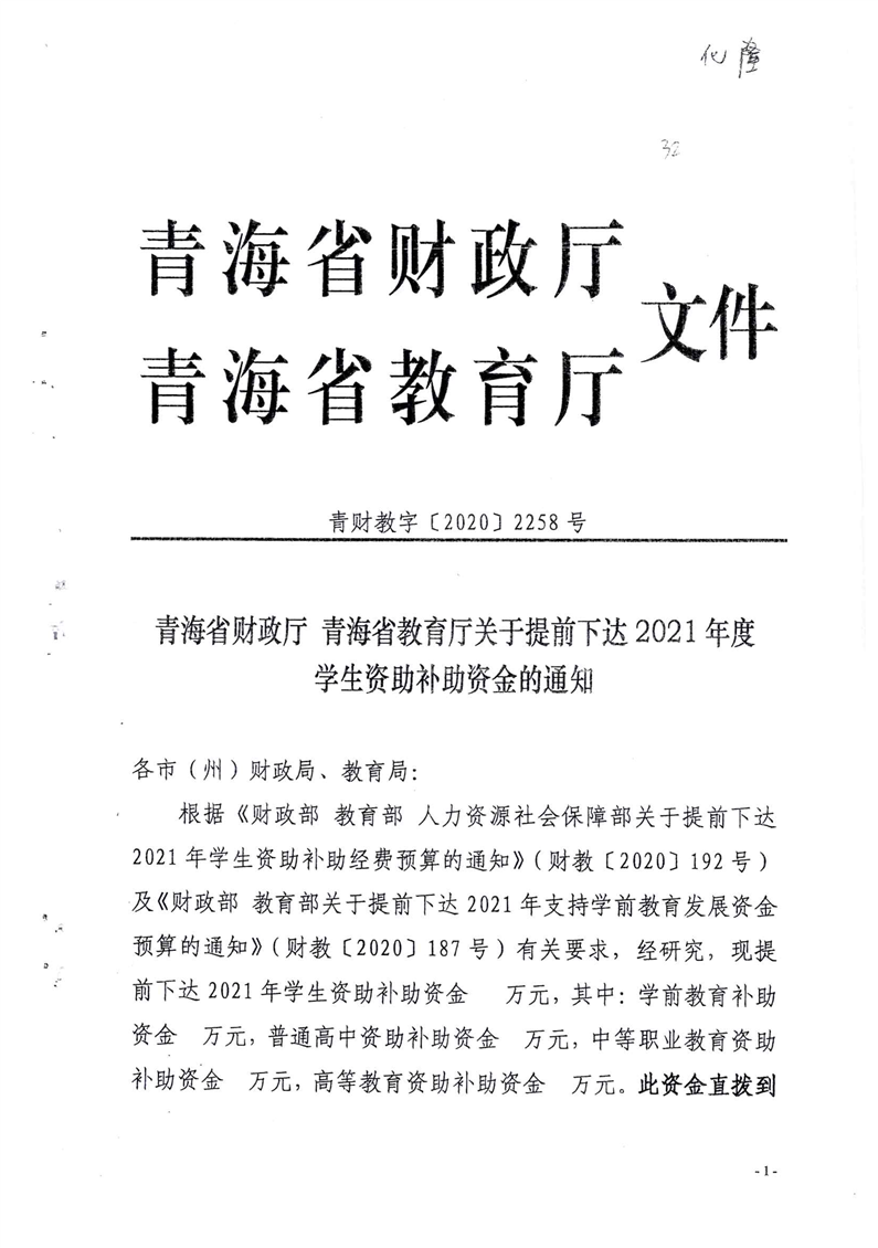 青海省财政厅青海省教育厅关于提前下达2021年度学生资助补助资金的通知