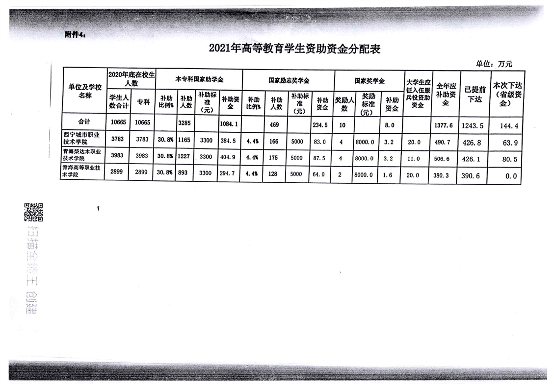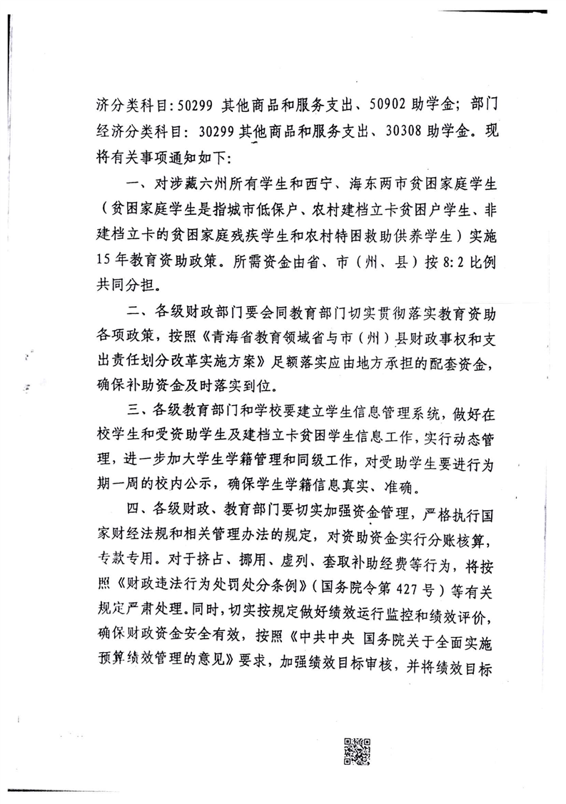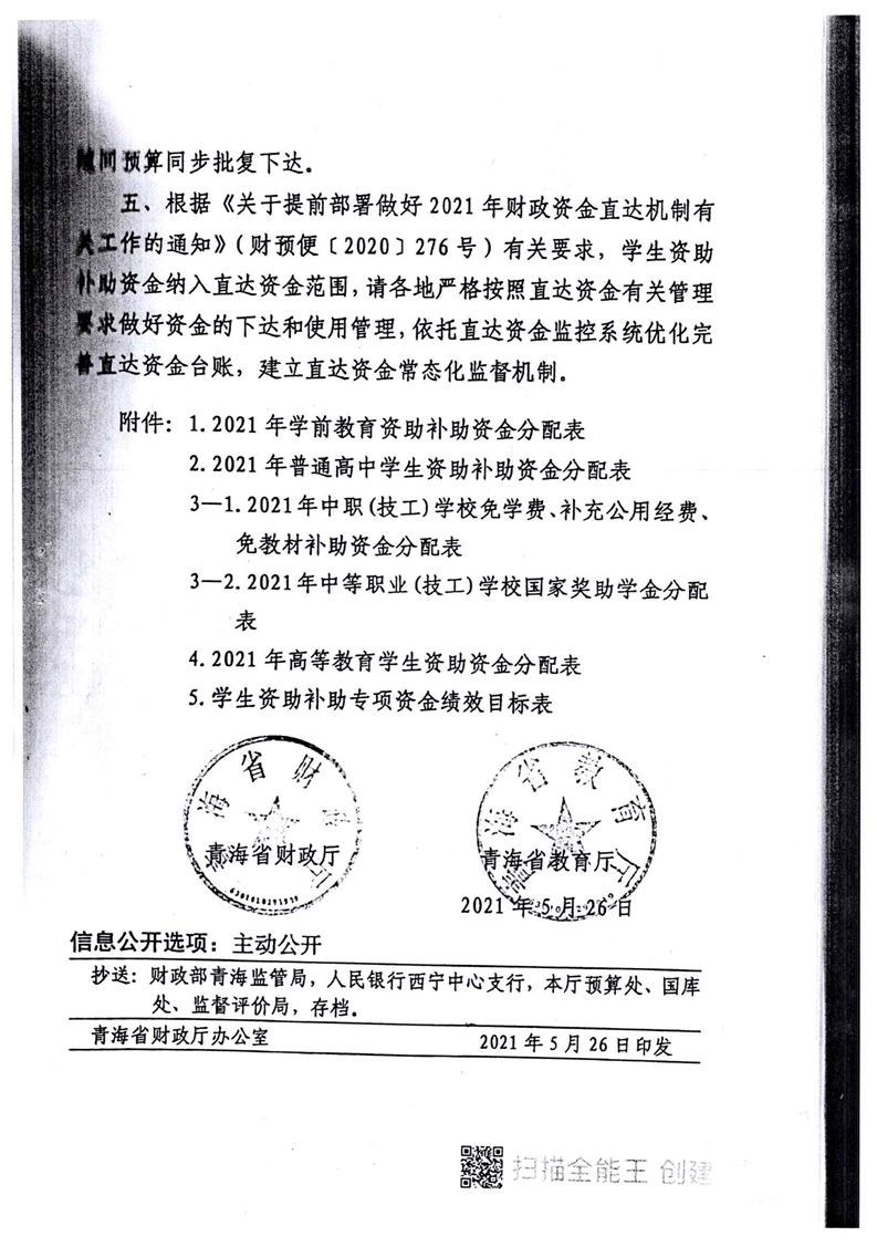 青海省财政厅青海省教育厅关于下达2021年度学生资助补助资金(市州学校)的通知