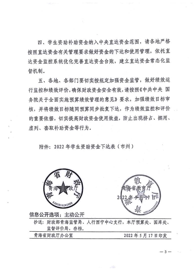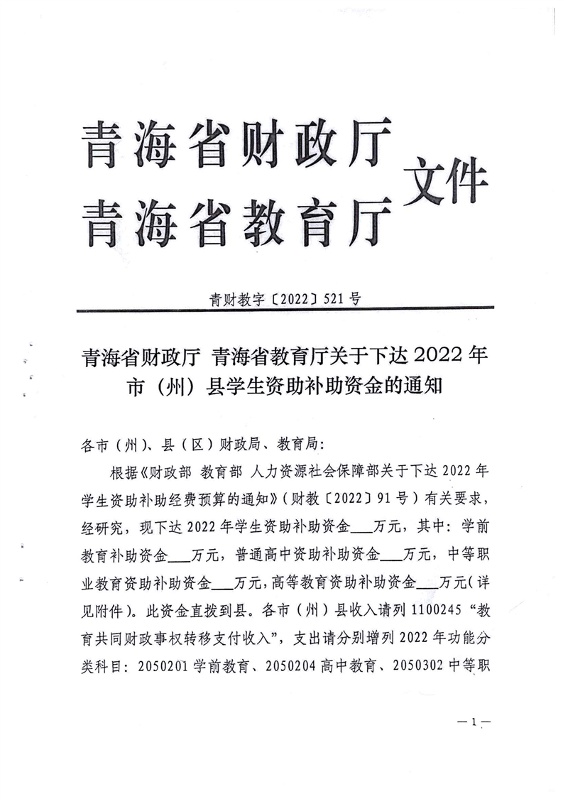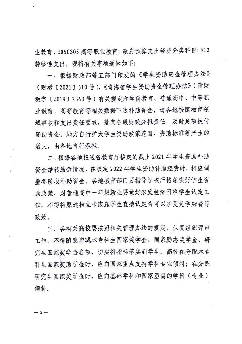 青海省财政厅青海省教育厅关于下达2022年市(州)县学生资助补助资金的通知
