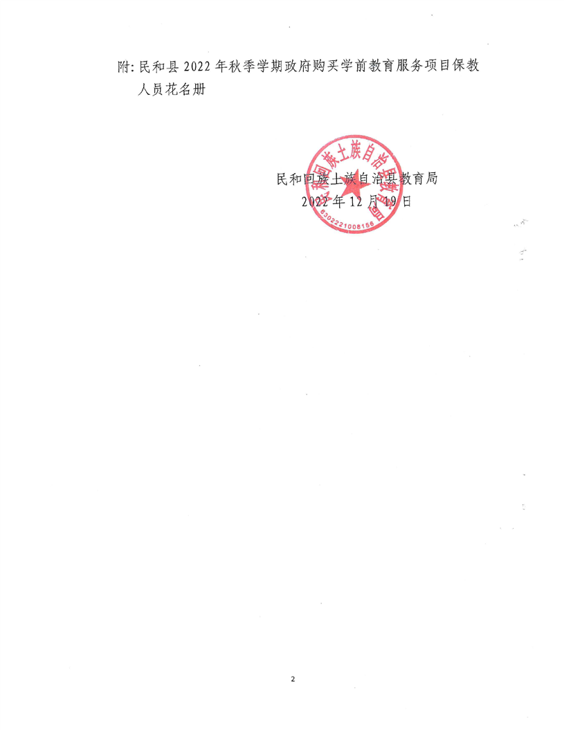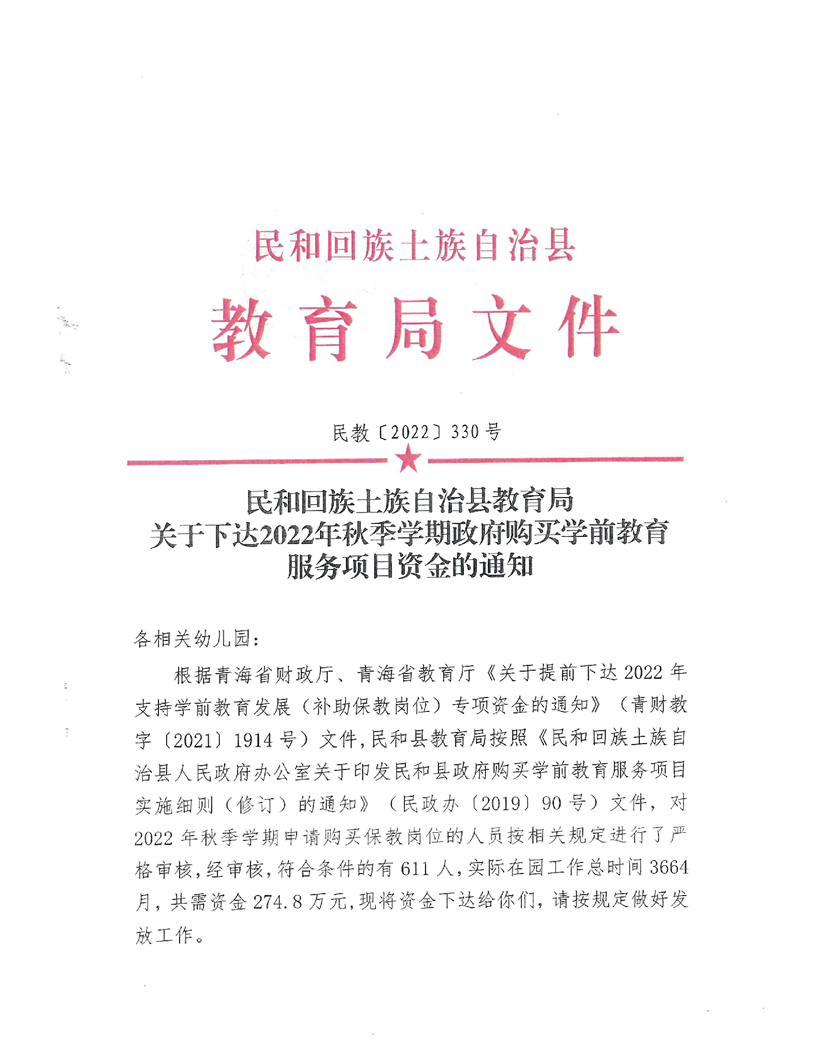 民和县教育局关于下达2022年秋季学期政府购买学前教育服务项目资金的通知