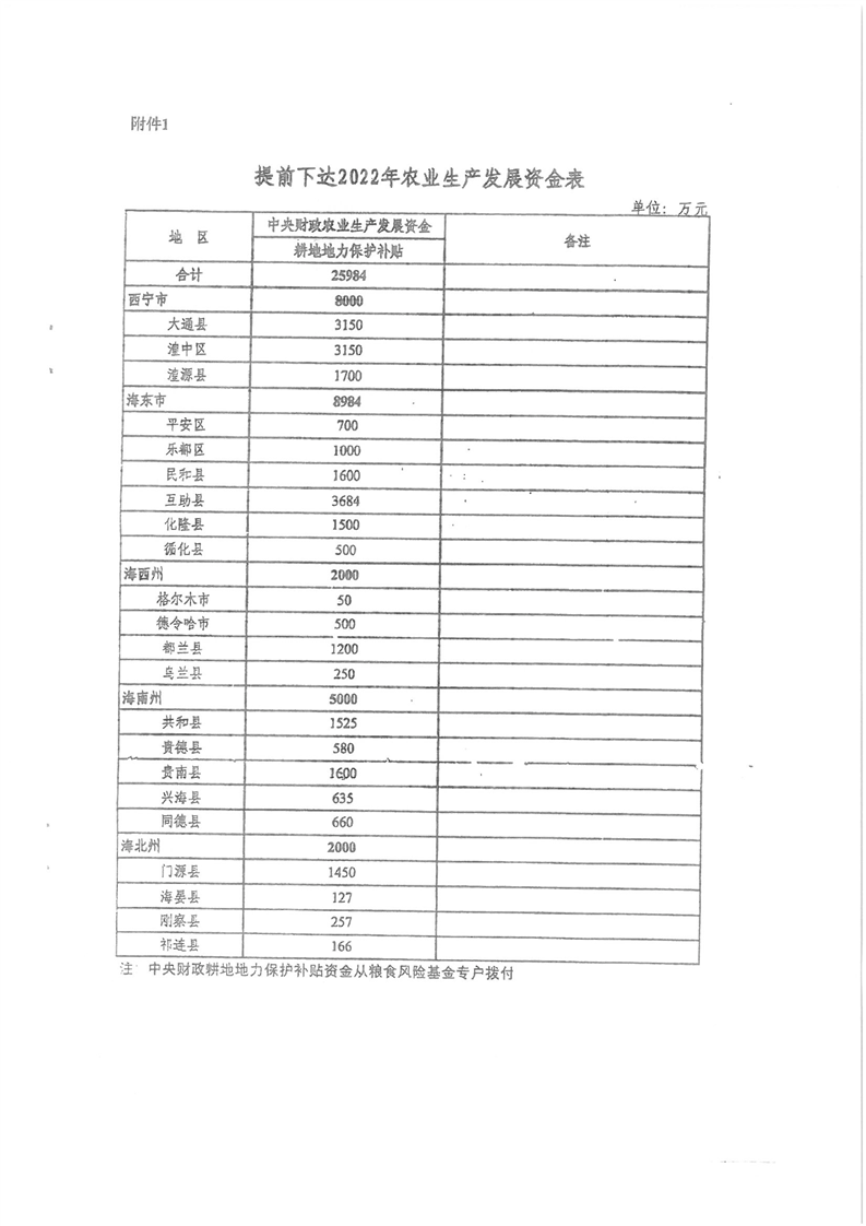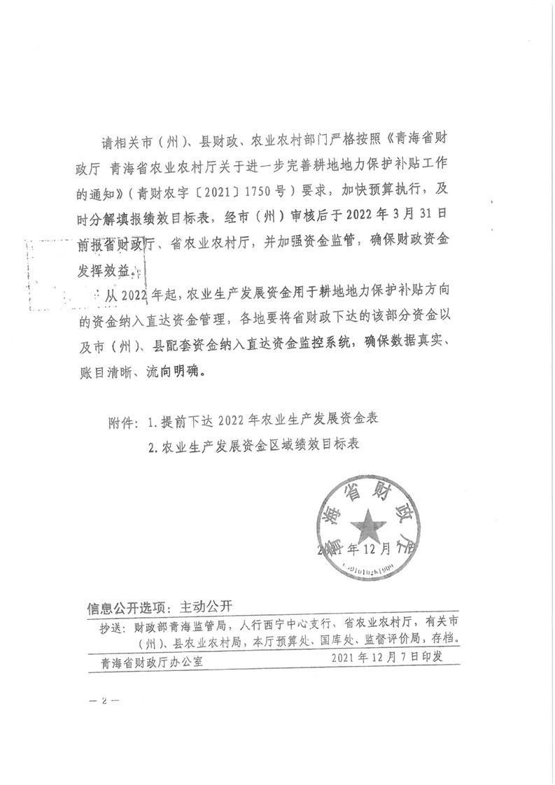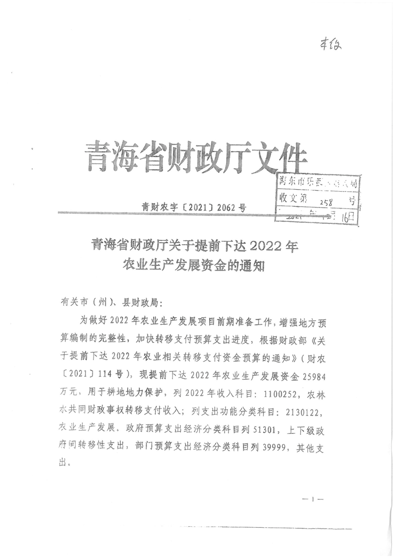 青海省财政厅关于提前下达2022年农业生产发展资金的通知