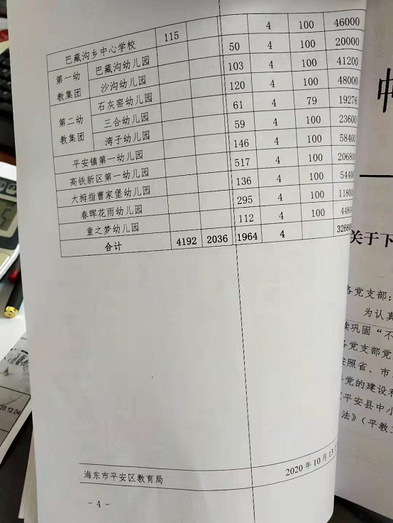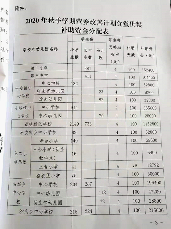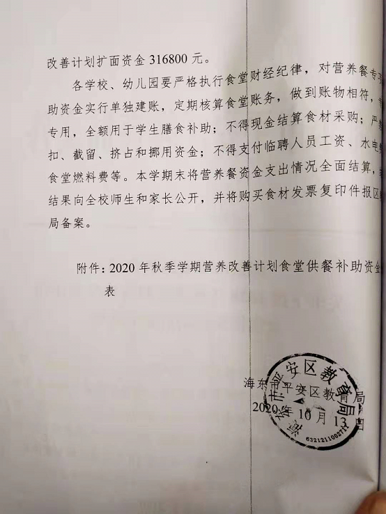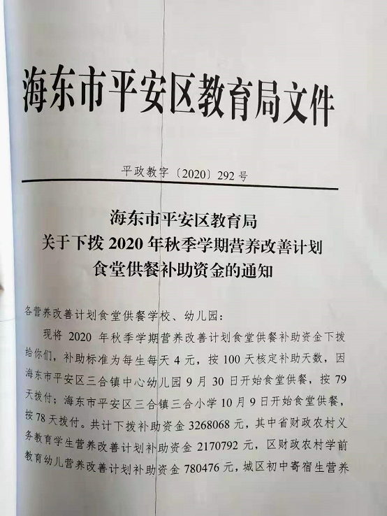 海东市平安区教育局关于下拨2020年秋季学期营养改善计划食堂供餐补助资金的通知