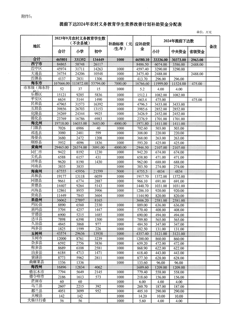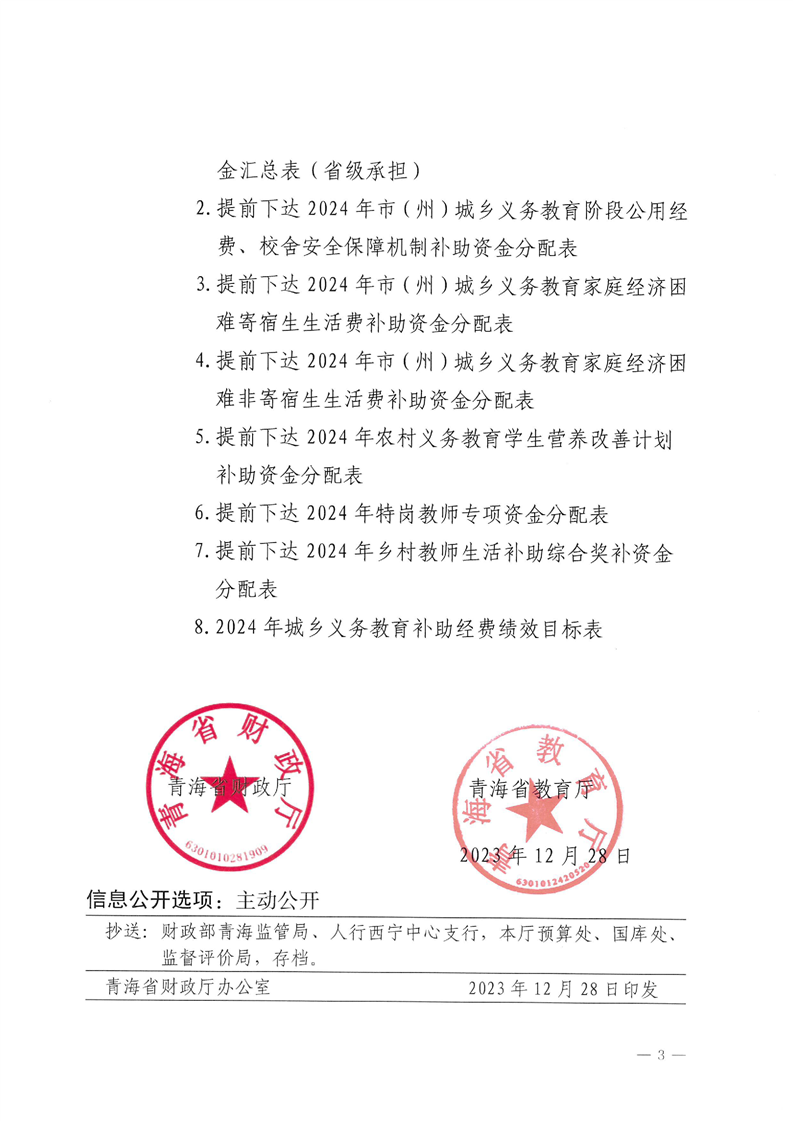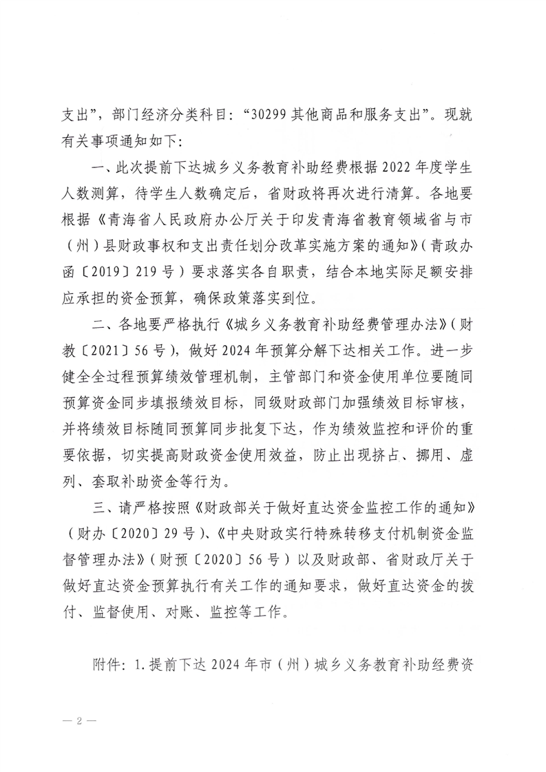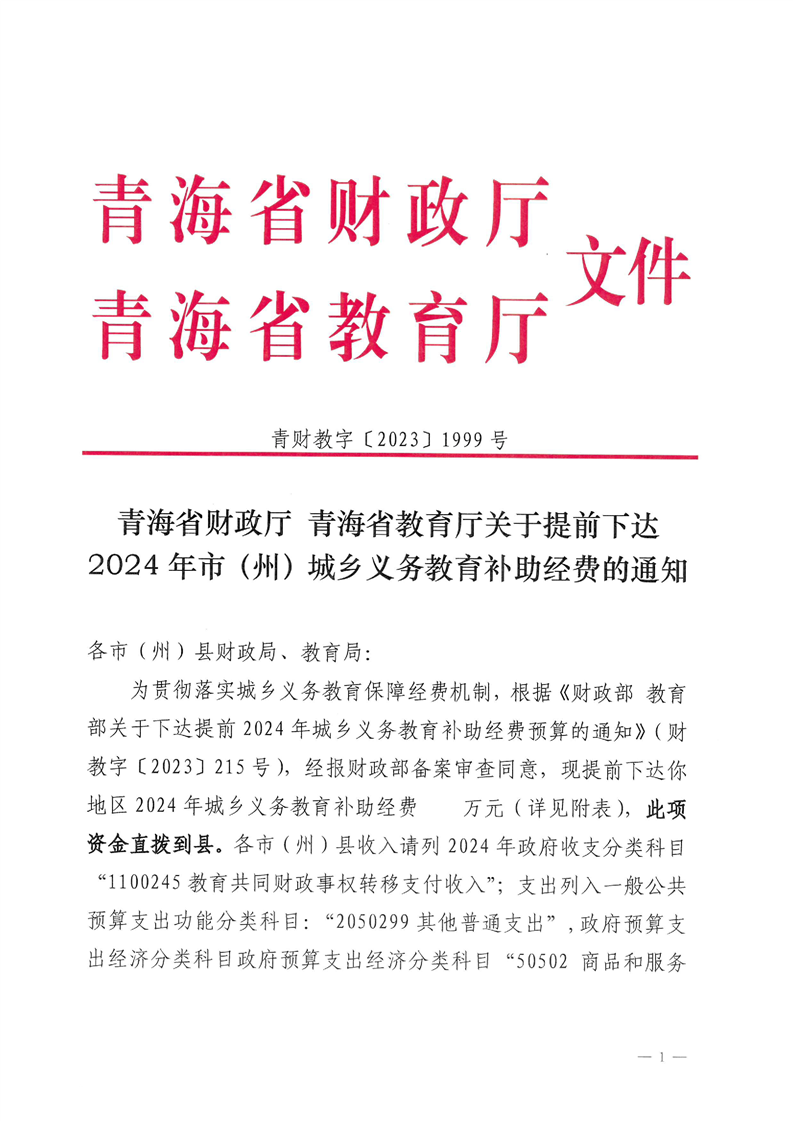 青海省财政厅教育厅关于提前下达2024年市(州)义务教育补助经费的通知