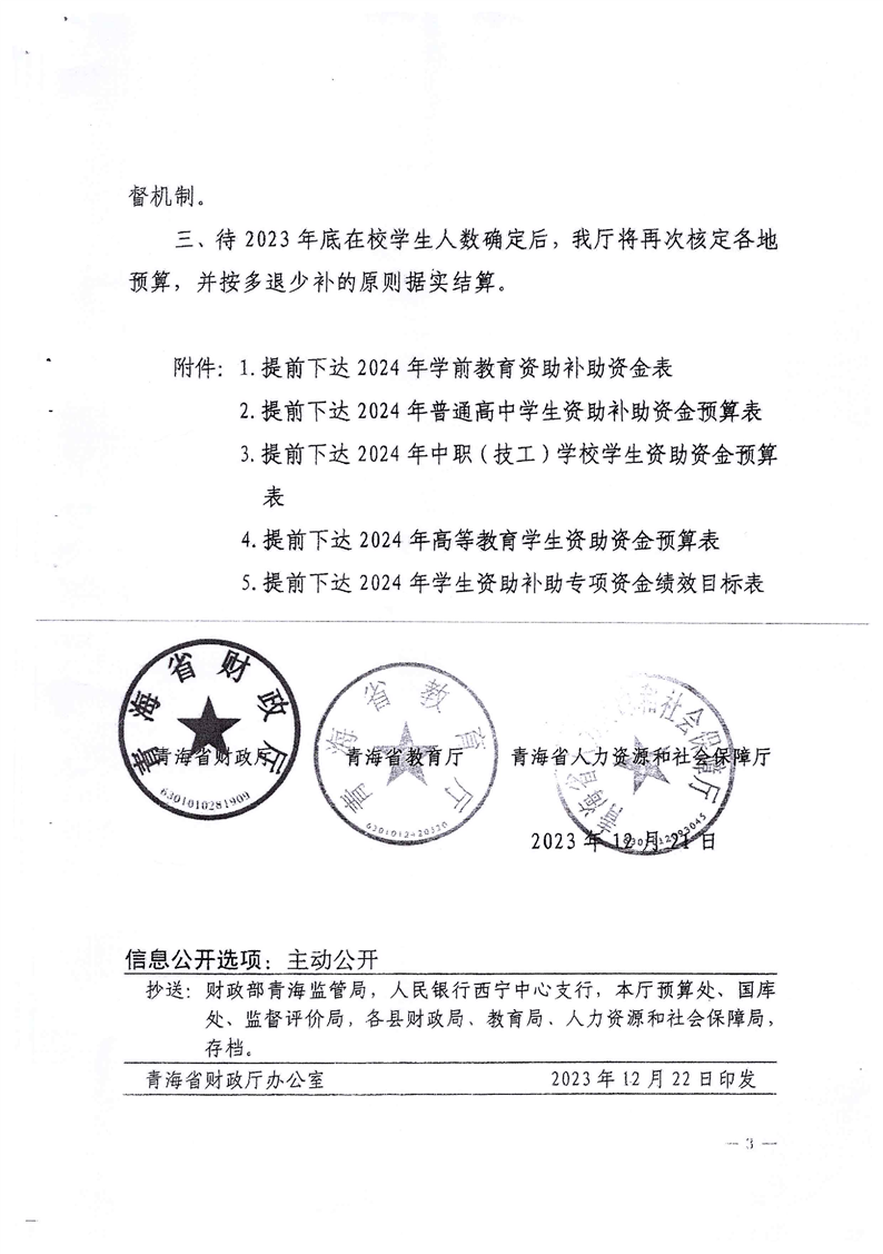 青海省财政厅、教育厅、人力资源和社会保障厅关于提前下达2024年学生资助补助资金的通知