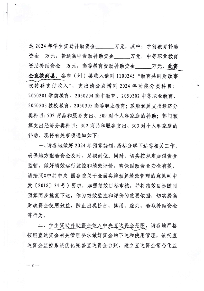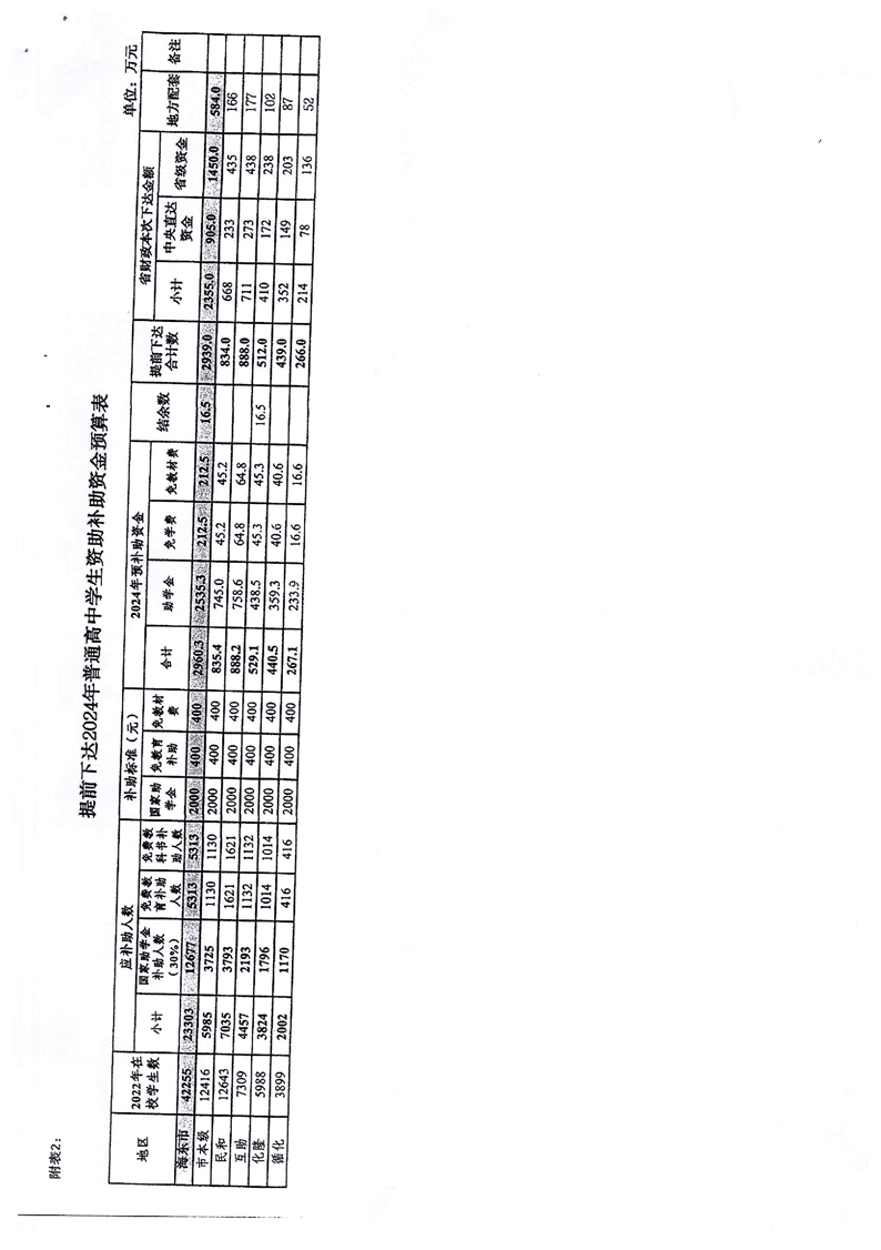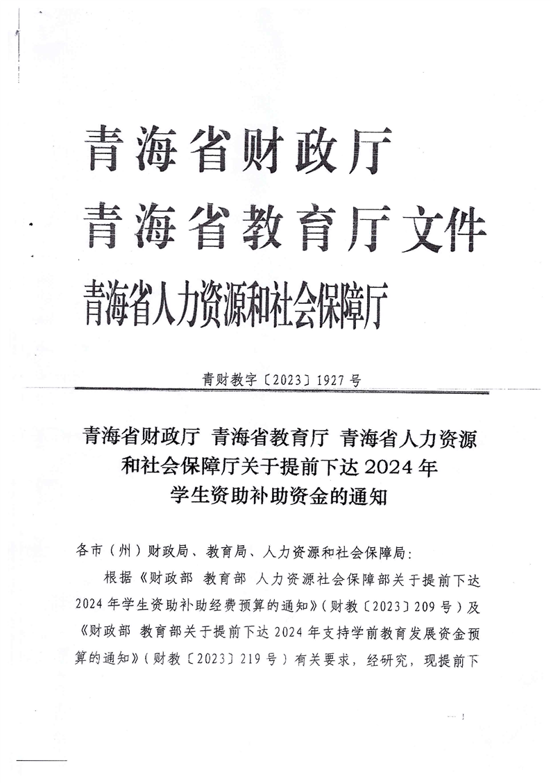 青海省财政厅、教育厅、人力资源和社会保障厅关于提前下达2024年学生资助补助资金的通知