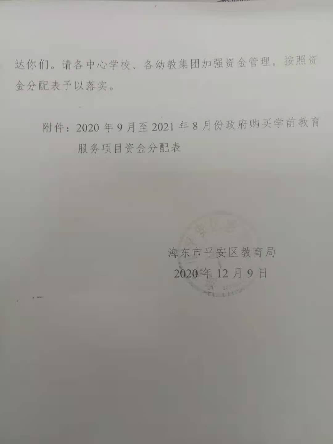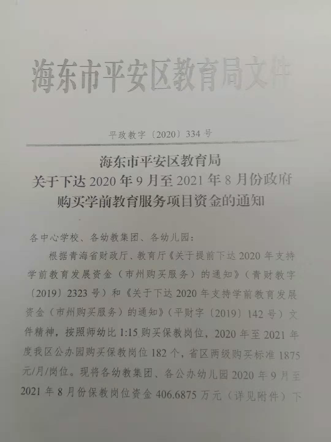 海东市平安区教育局关于下达2020年9月至2021年8月份政府购买学前教育服务项目资金通知